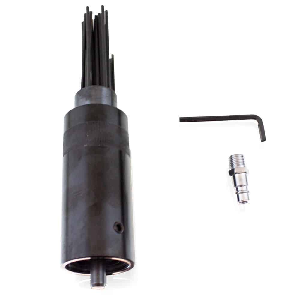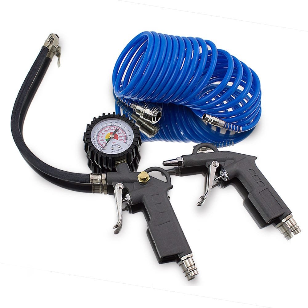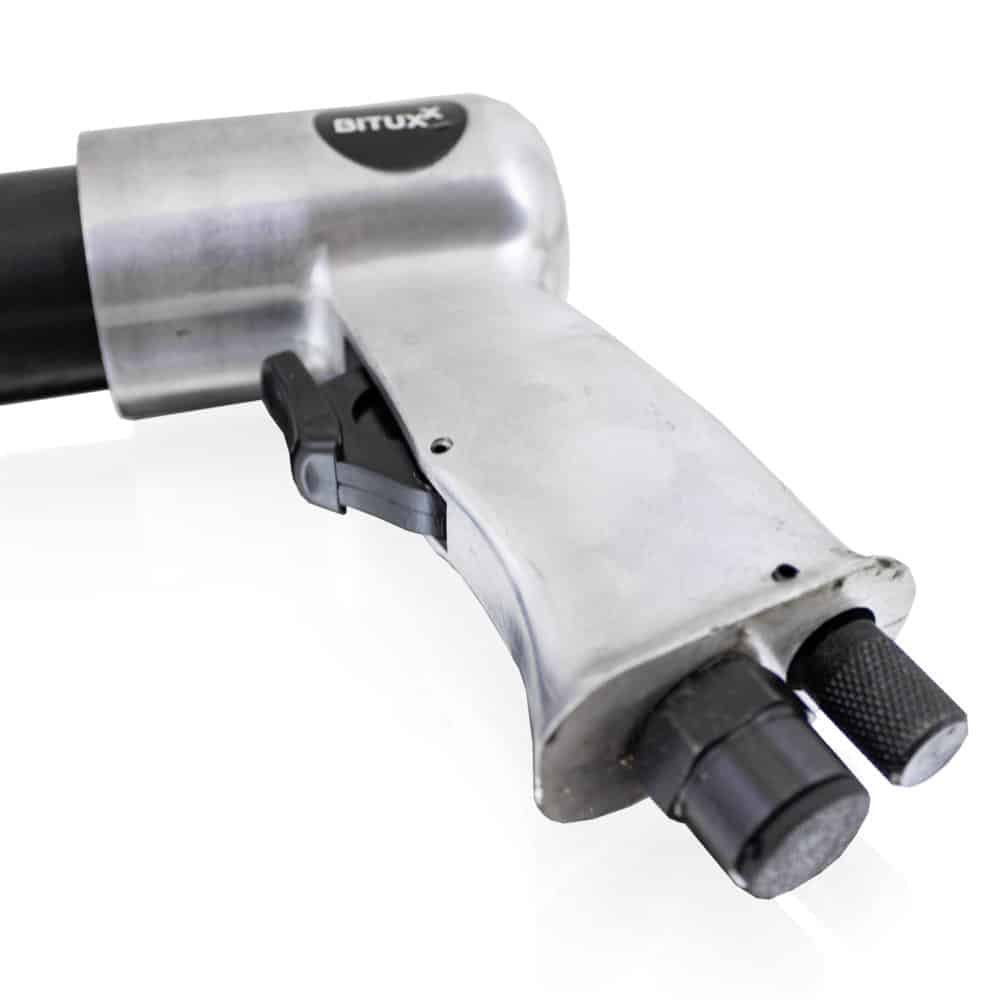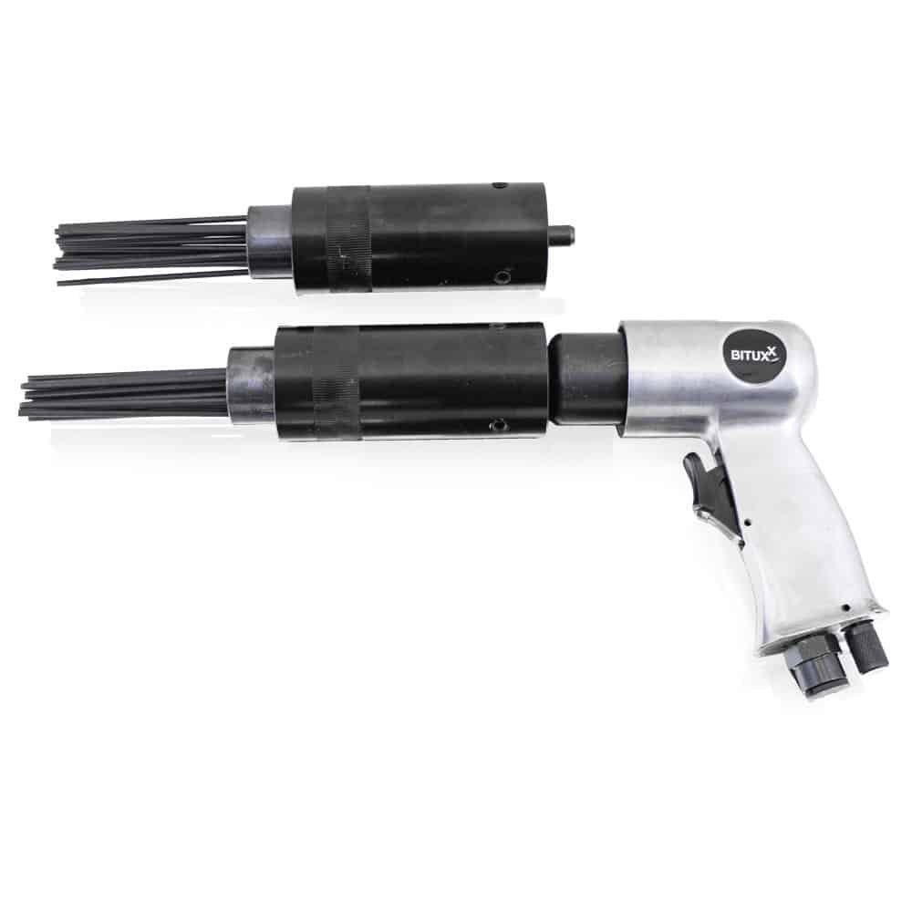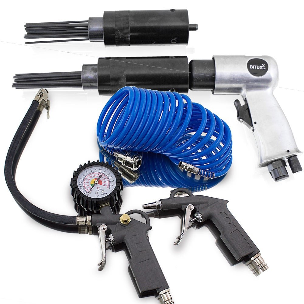 Apraksts tika tulkots automātiski, var rasties kļūdas. Rūsa un dažādi pārklājumi uz metāla detaļām viegli un ātri noņemami ar saspiestā gaisa adatas āmuru. Lieliski piemērots arī metināšanas izdedžu, ģipša, krāsas vai betona noņemšanai. Adatu augstā kvalitāte ļauj strādāt daudzas stundas, turklāt adatas galvu var viegli nomainīt pret citu. Komplekts sastāv no divām adatu galviņām ar 19 adatām, katra 3 mm diametrā. Pateicoties pistoles ergonomiskajai formai, āmurs ir drošs un ērts lietošanā. ; Tehniskās specifikācijas: Adatas: 3mm x 180 mm, 19 adatas uz galvu, Gāienu skaits: 4000 apgr./min., Darba spiediens: 6,3 Bar, Gaisa patēriņš: 260l/min, Saspiestā gaisa savienojums: 1/4″, Šļūtenes savienojums : 3/ 8 “, Vibrācijas līmenis: 8,6 m²/s, Skaņas spiediena līmenis: 99 dB, Kvalitātes prasības ‡ gaiss: attīrīts, bez kondensāta un eļļas miglas, Nepieciešams kompresors: minimālā katla jauda 50 litri. 3-daļīgs kompresora komplekta pistole ar mērinstrumentu, pūšanas pistoli, 5m spoles šļūteni. ; Ar riepu spiediena pistoli un gaisa kompresora pūšanas pistoli šis piederumu komplekts piedāvā plašu iespējamo pielietojumu klāstu darbnīcā. ; ;Spirālveida šļūtenei un pistolēm ir DN 7.2 EU ātrais savienotājs; Sastāvs: 1x saspiestā gaisa adatas skalieris, 2x adatas galva 19 adatas / Ø 3 mm, 1x saspiestā gaisa savienotājs, 1x sešstūra atslēga, 1x 5m izturīga spirālveida šļūtene, 1x manometra pistole, 1x pūšanas pistole ar īsu uzgali. ; ;