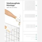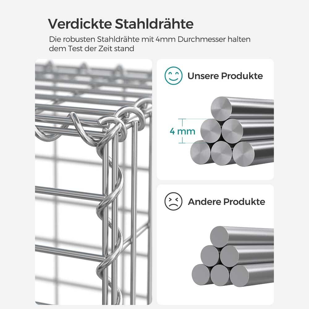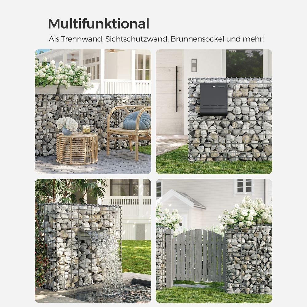 Apraksts tika tulkots automātiski, var rasties kļūdas. Izrotājiet savu dārzu ar šo 100 x 90 x 30 cm akmens gabionu un izveidojiet relaksācijas oāzi, kas atspoguļo jūsu personību. Ietaupiet laiku Kad esat izlēmuši, kur novietosiet gabionu, varat to ātri uzstādīt. Pirms gabiona aizvēršanas piepildiet stiepļu žogu ar akmeņiem un piestipriniet starplikas āķus. Simulējot cementa un ķieģeļu principu, jūs izveidojat laiku taupošu alternatīvu, kas arī izskatās labāk. Kvalitāte radošiem cilvēkiem Šis izturīgais akmens gabions, kas izgatavots no cinkota tērauda, ir piemērots visām jūsu vajadzībām: izveidojiet akmens soliņu savām dārza ballītēm vai aizsargājiet savu dabīgā akmens sienu. Ja pasūtāt vairākus gabionus vienlaikus, varat izveidot Vidusjūras akmens dārzu ar skaistiem ziediem un salviju. Ļaujiet savai radošumam darboties brīvi un piepildiet visus savus dārza sapņus ar šo gabionu!Produkta apraksts Informācija par produktu: – Krāsa: Sudraba – Materiāls: 40-60 g/m² cinkots tērauds – Izmērs: 100 x 90 x 30 cm (G x W x H ) – Atsevišķu režģu izmērs: 5 x 10 cm – Metāla stieples diametrs: 4 mm – Āķu garums: 30 cm – Spirāles solis: 5 cm – Svars: 11,9 kg Piegādes komplekts: – 6 x metāla režģi – 12 x spirāles – 9 x starplikas āķi – 1 x instrukcijas (DE, EN) , FR, ES, IT) SONGMICS Piezīmes:- Lai izvairītos no negadījumiem, turiet bērnus prom no darba zonas. Nepārvietojiet produktu, kad tas ir uzstādīts.