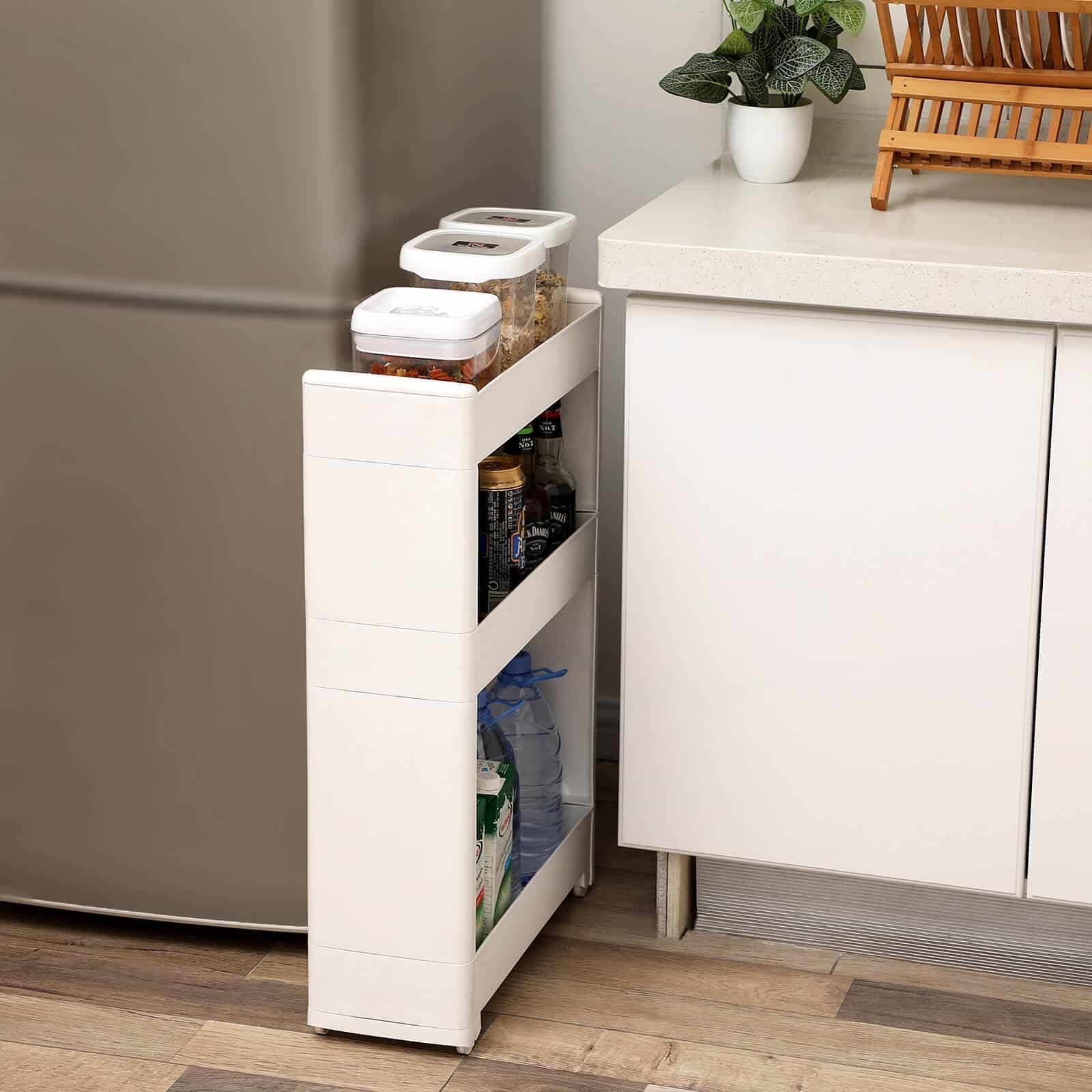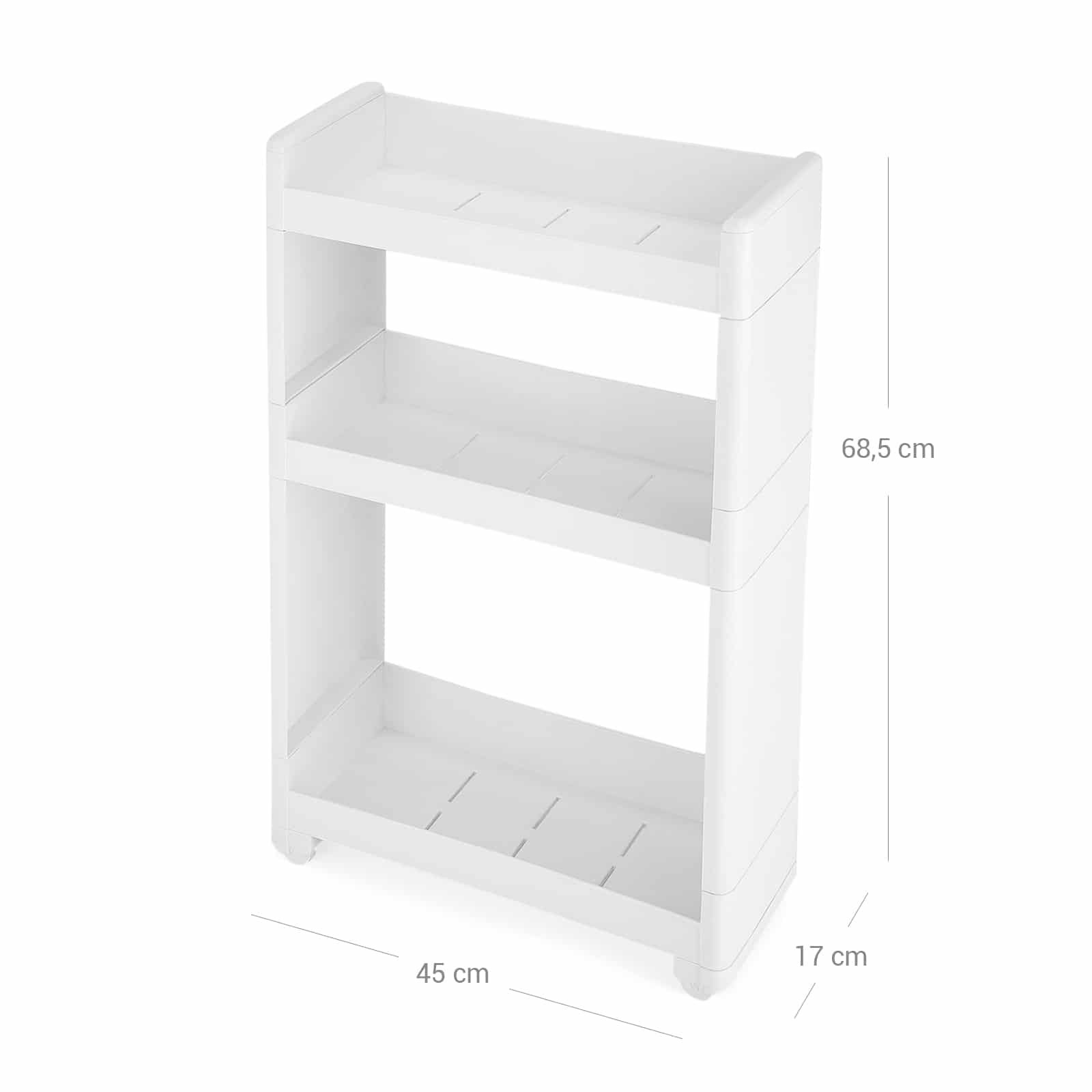 Apraksts tika tulkots automātiski, var rasties kļūdas. Šaurs plaukts stūriem un nišām: 17 cm platais plaukts iederas stūros un nišās un piedāvā daudz vietas. To var ātri pārvietot uz priekšu un atpakaļ ar vienkāršiem riteņiem, un ar savu izturīgo materiālu tas kalpos gadiem ilgi virtuvē, vannas istabā, pagrabā vai pieliekamajā. Daudz vietas uzglabāšanai: 3 uzglabāšanas kastes ar augstumu 33,8 cm un 22,8 cm. Plauktā var ievietot arī lielākas pārtikas preces, grāmatas vai vannas istabas preces Izturīgs plaukts uz ritenīšiem: Vienkāršie 4 riteņi ļauj plauktu stumt tikai uz priekšu un atpakaļ, tāpēc to ir viegli pārvaldīt un plaukts neaizķeras. PP plastmasa padara to ļoti izturīgu un viegli kopjamu, jo to var viegli mazgāt ar ūdeni. Informācija par produktu: Krāsa: balta Materiāls: PP plastmasa Produkta izmēri: 45 x 17 x 68,5 cm (G x P x A) Svars: 1,75 kg Nestspēja: 15 kg Piegādes komplekts: 1 x nišas plaukts 1 x instrukcija (DE, EN) , IT, FR, ES) SONGMICS Piezīmes: Šo plauktu ieteicams novietot atbilstoša izmēra nišā, lai iegūtu stabilitāti Lai izvairītos no plaukta bojājumiem un nodrošinātu savienojošo daļu stabilu savienojumu, NEmontējiet un neizjauciet produktu vairākas reizes. Turiet plauktu tālāk no siltuma avotiem, lai izvairītos no bojājumiem.