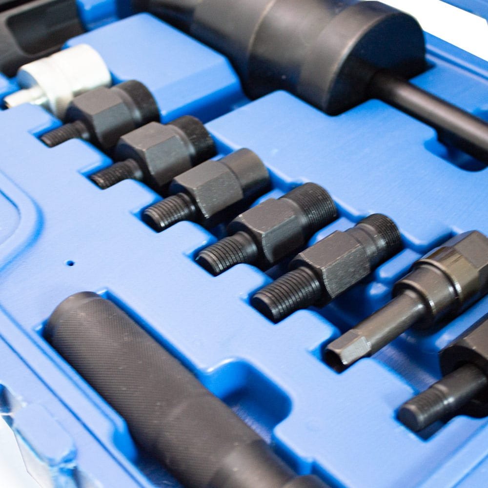 Apraksts tika tulkots automātiski, var rasties kļūdas. Inžektoru izvilkšanas komplekts ļauj viegli un ātri noņemt iestrēgušus sprauslas no CDI CRDI CR HDI sistēmām. Lodveida savienojums ļauj izmantot āmuru pat šaurās, grūti sasniedzamās vietās. Iekļautie adapteri ir piemēroti lielākajai daļai iesmidzināšanas sistēmu ražotāju (BOSCH, SIEMENS, DELPHI, DENSO). Obligāti katrā autoservisā! ; Adapteri: M14xM14 (iekšējā vītne), M17xM14 (iekšējā vītne), M25xM14 (iekšējā vītne), M27xM14 (iekšējā vītne), M27xM14 (ārējā vītne), M20xM14 (ārējā vītne). ; Hex ligzdas: 25mm, 27mm, 29mm, 30mm. ; 12,5 mm (1/2″) patrona, 10 mm sešstūra atslēga, lodveida šarnīrs. ; ; ;