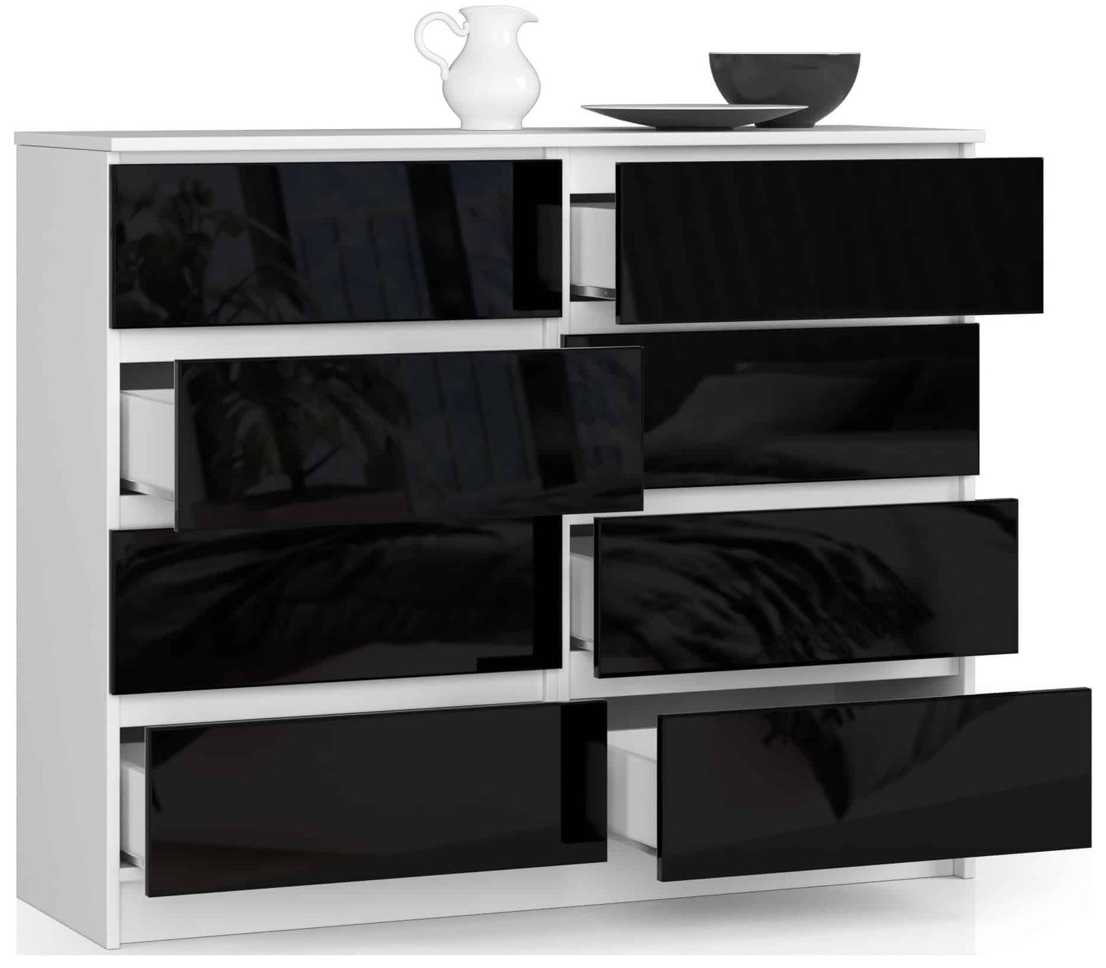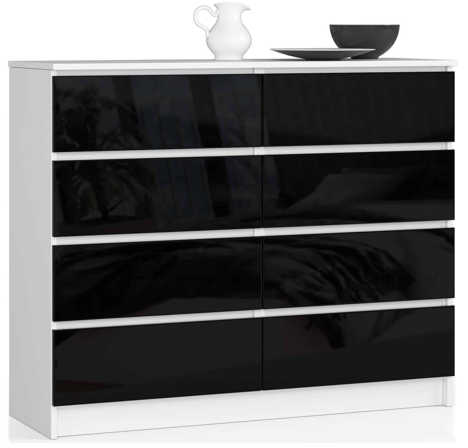 Apraksts tika tulkots automātiski, var rasties kļūdas. – Kumodes korpuss izgatavots no 16 mm balta matēta laminēta plātnes, izturīga pret nodilumu – Priekšējās daļas izgatavotas no AKRYL 19 mm plātnes ar spīdīgi melnu dekoru – Atvilktnes atrodas uz metāla rullīšu vadotnēm – malas pārklātas ar ABS malu laba aizsardzība pret bojājumiem – pats par sevi – savākšanas kaste – Piegādes ceļvedis – Garantija 24 mēneši.