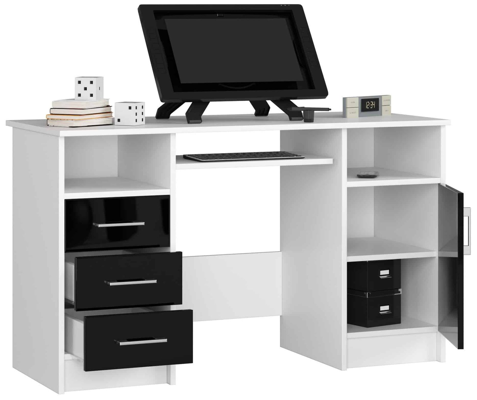 Apraksts tika tulkots automātiski, var rasties kļūdas. Piedāvājam baltu Ana datorgaldu ar spīdīgi melnām fasādēm. Rakstāmgalds sastāv no trim ietilpīgām atvilktnēm, bīdāma klaviatūras plaukta un sānu skapja, kura iekšpusē papildus ir viens plaukts. Atvilktnēm un durvīm ir sudraba rokturi. Korpuss un fasādes izgatavotas no izturīgas 16 mm biezas laminētas plātnes. Turklāt augšpuse, sāni un priekšpuse ir pārklāti ar ABS loku, kas ir izturīgāks pret berzi un dažādiem mehāniskiem bojājumiem. Atvilktnes un tastatūras plaukts pārvietojas uz metāla rullīšu vadotnēm, un vajadzības gadījumā tos var viegli noņemt un notīrīt. Rakstāmgaldam ir skandināvu stils, mūsdienīgs un minimālistisks izskats, ideāli piemērots birojam, bērnu istabai vai jauniešu istabai. Universālas krāsas un vienkāršais dizains lieliski iederēsies jebkurā interjerā un viegli kombinējamas ar citām līdzīgās krāsās esošām mēbelēm. Lielā galda virsma ir piemērota monitoram, lampai un citiem piederumiem. Rakstāmgalds ir 124 cm garš, 74 cm augsts un 52 cm dziļš. Kopējais svars 45 kg.. Mēbeles tiek pārdotas iepakojumos pašmontēšanai, kopā ar detalizētu montāžas instrukciju. Ražotājs nodrošina 24 mēnešu garantiju. – Rakstāmgalds izgatavots no nodilumizturīgas laminētas plātnes – Ir daudz vietas jebkuram izkārtojumam – Iekšpusē ir viens plaukts ar durvīm – Atvilktņu fasādes un durvis izgatavotas no glancētas melnas laminētas plātnes – Atvilktnes un klaviatūras plaukts atrodas uz metāla rullīšu vadotnēm – Galda virsma, sāni un fasādes pārklātas ar ABS malu – Sudraba atvilktne un durvju rokturi – DIY galds – Rokasgrāmata komplektā – Garantija 24 mēneši.