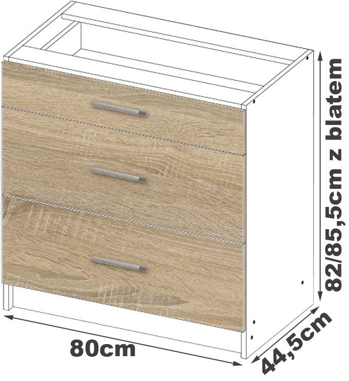 Apraksts tika tulkots automātiski, var rasties kļūdas. Virtuves skapis S80 SZ3 ir viens no daudzajiem Lima kolekcijas piedāvājumiem, kas patika klientiem. Tas nodrošina daudz vietas virtuvē, kur uzglabāt nepieciešamās lietas – gan ēdienu, gan traukus, traukus vai sīkumus, kas atvieglo maltīšu gatavošanu. Skapis sastāv no trim atvilktnēm. Mēbelēs apvienotas divas ļoti modernas un praktiskas krāsas, kas neapšaubāmi ir baltais un sonomas ozols. Spilgti rokturi lieliski papildina kopumu. Gan prezentētais iebūvējamais skapis, gan citas Lima kolekcijas mēbeles ir izgatavotas no laminētas plātnes, kas nodrošina izturību un nodilumizturību. Skapis ar atvilktnēm ir neaizstājams elements jebkurā virtuvē. Aicinām iepazīties ar šo un citiem Lima kolekcijas piedāvājumiem un izvēlēties savai virtuvei piemērotākos variantus. Korpusa krāsa – balta Priekšpuses krāsa – Sonoma ozols p> – Skapis izgatavots no nodilumizturīgas laminētas plātnes. – Balta galda virsma ar sudraba apdari BEZ MAKSAS!!!